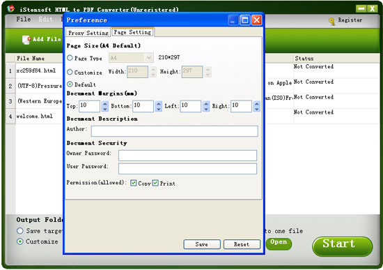 You are supported to set owner or user password to protect the output PDF files from opening, printing, coping and modifying by unauthorized users. And you can set & customize page size, margin and title, or author information for the output PDF as you like.