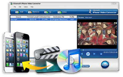 Convert almost all popular video formats like AVI, MP4, MPEG, WMV, XviD, H.264, DAT, MOV, ASF, FLV, etc. to iPhone/iPhone 3G/iPhone 3G S MPEG-4, H.264 and MOV to iPhone/iPhone 3G/iPhone 4S MP4 video or H.264 video.