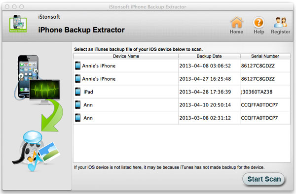 When the installation is done, you may run this software on your Mac computer. As soon as it is launched, this software will scan all iPhone/iPad/iPod backup files on your local disk automatically. All backup files will be listed with detailed Info: Device Name, Backup Date and Serial Number.