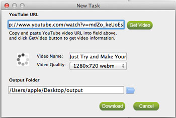 Step 2. Open your favorite YouTube movies in Browser. Click the "New Task" on the top of the software. A new window will come up for you to enter URL of the YouTube videos. Just copy and paste URL to it and click "Get Vide" to let the software analyze the file name and video quality for you. You just need to click the "Download" to start downloading YouTube video to your Mac.